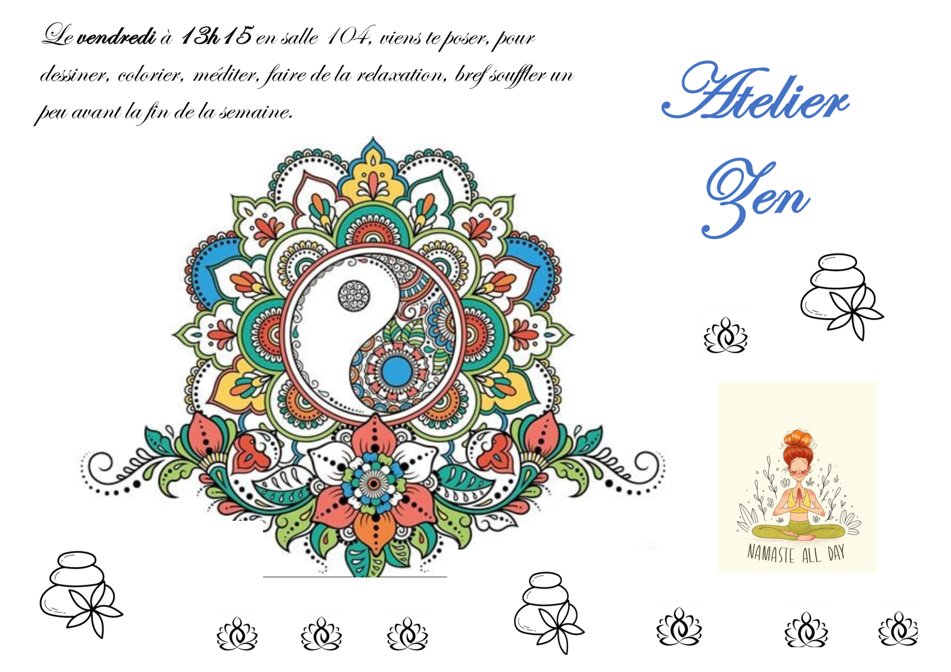 - un atelier Zen le vendredi de 13h15 à 13h50 en 104.