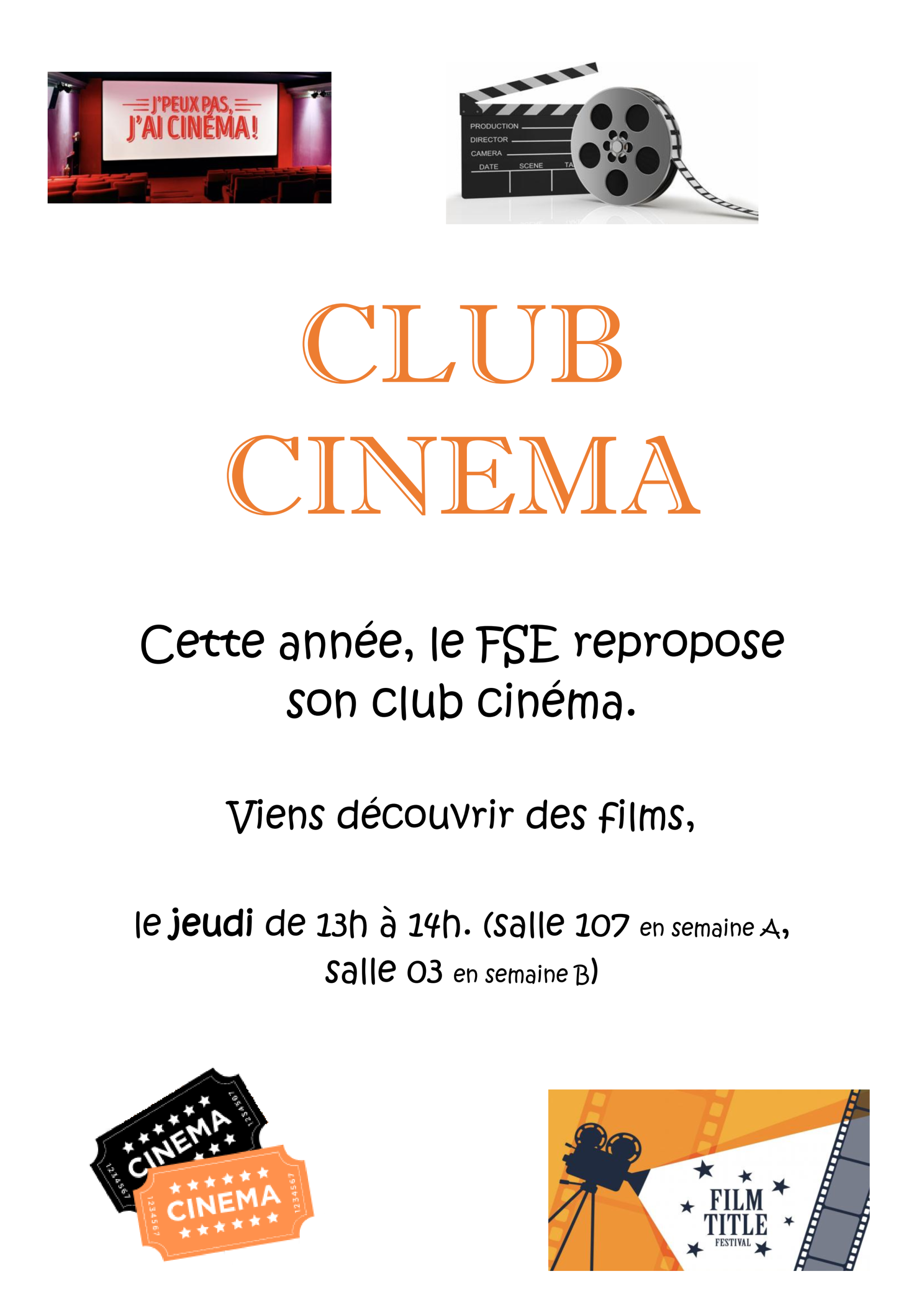 - un club Cinéma le jeudi de 13h10 à 13h50 en 03 ou 107 (selon les semaines A ou B).