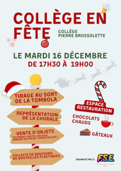 Le Foyer Socio-Éducatif du collège invite l’ensemble des élèves, familles et personnels à partager un moment convivial et solidaire le mardi 16 décembre 2025, de 17h30 à 19h.